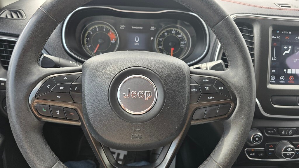 M J McGuire Company is excited to offer this outstanding 2022 Jeep Cherokee Trailhawk in Hydro Blue Pearlcoat Beautifully equipped with Comfort/Convenience Group (Auto-Dimming Rear-View Mirror, Hands-Free Power Liftgate, Security Alarm, and Universal Garage Door Opener), Premium Leather Package (Exterior Mirrors w/Memory, Power 8-Way Adjustable Front Passenger Seat, Power Passenger Lumbar Adjust, Premium Leather Trimmed Bucket Seats, Radio/Driver Seat/Exterior Mirrors Memory, and Ventilated Front Seats), Quick Order Package 27E, Trailer Tow Group (7 & 4 Pin Wiring Harness, Class III Receiver Hitch, and Trailer Tow Wiring Harness), 3.517 Final Drive Ratio, 4-Wheel Disc Brakes, 4G LTE Wi-Fi Hot Spot, 6 Speakers, 8.4" Touchscreen Display, ABS brakes, Air Conditioning, Alloy wheels, AM/FM radio: SiriusXM, Anti-whiplash front head restraints, Apple CarPlay, Apple CarPlay/Android Auto, Automatic temperature control, Brake assist, Cloth/Premium Vinyl Bucket Seats, Compass, Delay-off headlights, Driver door bin, Driver vanity mirror, Dual front impact airbags, Dual front side impact airbags, Electronic Stability Control, For Details, Visit DriveUconnect.com, For More Info, Call 800-643-2112, Four wheel independent suspension, Front anti-roll bar, Front Bucket Seats, Front Center Armrest, Front dual zone A/C, Front fog lights, Front License Plate Bracket, Front reading lights, Fully automatic headlights, Google Android Auto, GPS Antenna Input, Heated door mirrors, Heated front seats, Heated steering wheel, Illuminated entry, K-Black Door Trim Panel Appliques, K-Black Interior Accents, Knee airbag, Leather Shift Knob, Low tire pressure warning, Occupant sensing airbag, Off Road Suspension, Outside temperature display, Overhead airbag, Overhead console, Panic alarm, ParkView Rear Back-Up Camera, Passenger door bin, Passenger vanity mirror, Power door mirrors, Power driver seat, Power steering, Power windows, Radio data system, Radio: Uconnect 4 w/8.4" Display, Rain sensing wipers, Rear anti-roll bar, Rear reading lights, Rear seat center armrest, Rear side impact airbag, Rear window defroster, Rear window wiper, Remote keyless entry, Roof rack: rails only, SiriusXM Radio Service, SiriusXM Satellite Radio, Speed control, Speed-sensing steering, Split folding rear seat, Spoiler, Steering wheel mounted audio controls, Tachometer, Telescoping steering wheel, Tilt steering wheel, Traction control, Trip computer, Turn signal indicator mirrors, USB Host Flip, Variably intermittent wipers, Voltmeter, and Wheels: 17" x 7.5" Painted Diamond Cut Aluminum!